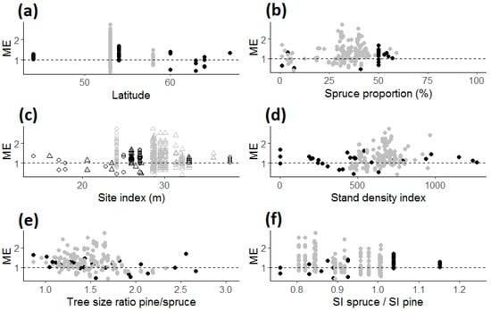 Mixing effect ME against different variables during different measurement periods: (a) latitude, (b) site index classes for spruce (circle) and pine (triangle), (c) the ratio of the mean tree size of both tree species in the mixed stand, (d) spruce proportion, (e) stand density index SDI, and (f) the ratio between both site indices (grey color indicates where growth of pure spruce was estimated).