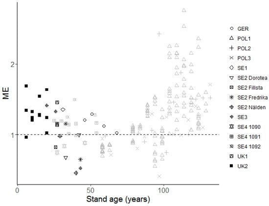 Pearson correlations between ME ratios and single explanatory variables were small and nonsignificant (p > 0.05). Site index for spruce and latitude resulted in R2 values of only 0.2 (Figure 4b). Correlations between stand age and ME ratio resulted in R2 = 0.4. This weak indication of a positive relationship between ME and stand age was strongly influenced by the observations from single studies, e.g., POL. When the data were restricted to actual increment measurements and, thereby, to stand ages of <70 years, a negative correlation was found (Figure 5). Again, the correlation did not improve when mixture proportions were included in the calculation of ME.