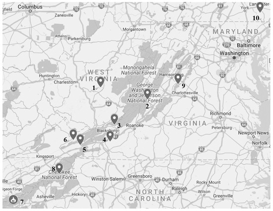 Map of locations of Laricobius osakensis release sites used in the study. Pins are numbered by field site. 1. Carnifex, WV; 2. Goshen, VA; 3. Mountain Lake, VA; 4. Powhatan Boy Scout Camp, VA; 5. Hungry Mother State Park, VA; 6. Saltville, VA; 7. Great Smoky Mountain National Park, TN; 8. Cherokee National Forest, TN; 9. Shenandoah National Park, VA; 10. Trout Run, PA.