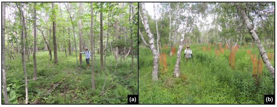 In 2010, a vegetation analysis of the forested area was undertaken to identify the forest communities. Digital topographical and ecoforest maps, and aerial photos (orthophotos) were used. Using these sources of information and ArcGIS (Esri, Redlands, CA, United States), a set of parallel transects were used to determine the location of 71 permanent plots (20 m × 20 m), where vegetation, soil and site characteristics where measured. A Detrended Correspondence Analysis of the 71 forest vegetation plots was done and two community types presenting a high potential for white pine and hardwood underplanting where identified: (1) the White ash community type, which was located on mesic sites dominated by young forests regenerated on old-fields (average largest tree age = 47) and (2) the very young Grey birch-balsam poplar-elm community type that also has regenerated on old fields (average largest tree age = 40) (Figure 1). Mean total basal area (trees + saplings) was 30 m2/ha for the White ash community type and 18 m2/ha for the Grey birch-balsam poplar-elm community type. Additional details related to site description can be found in Truax et al. [41].