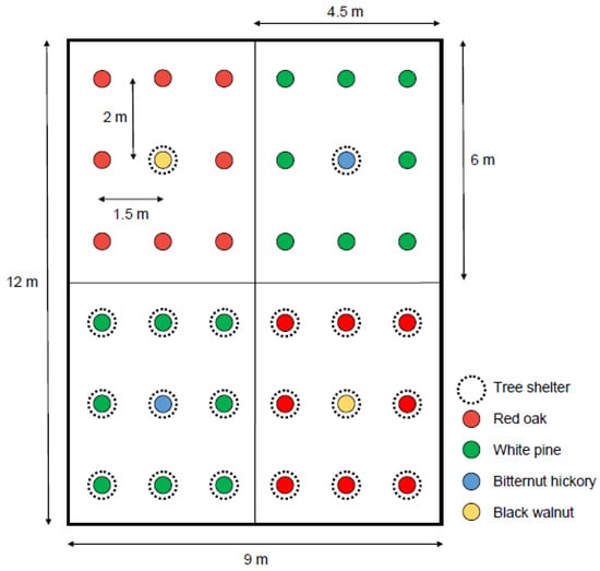 A complete randomized block design with 25 blocks and two factors (Tree species and Deer protection treatment) was established within the two selected forest community types. Among the 25 blocks, 8 were located in the White ash community type and 17 were located in the Grey birch-balsam poplar-elm community type. Each block measured 9 × 12 m and contained two species (red oak and white pine) and two deer protection treatments (a tree shelter treatment and a control treatment with no protection) for a total of 100 experimental plots (2 Tree species × 2 Deer protection treatments × 25 blocks). Each plot measured 4.5 × 6 m and contained 8 trees of a single species/treatment combination. In the middle of each plot, one bitternut hickory or one black walnut seedling was also planted, and these additional species were always protected with a tree shelter. Tree spacing was 1.5 × 2 m between all trees. Overall, the initial experimental design contained 400 red oak seedlings and 400 white pine seedlings, half of which were protected by tree shelters, but also 50 bitternut hickory seedlings and 50 black walnut seedlings, all protected by shelters. Figure 2 gives an overview of the experimental design.