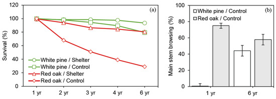 For white pine, the impact of deer was less striking than for red oak (Figure 3 and Figure 4). By the end of the first growing season, 75% of red oaks had their main stem browsed, while almost no deer browsing was observed on white pine seedlings (Figure 3b). Such a browsing pattern reflects the tendency of deer to browse heavily on deciduous species during the growing season, while conifers are more heavily browsed during the dormant season when other food sources are scarce [10]. Also, at planting, white pine seedlings were relatively small (21 cm of height) and less conspicuous in the understory vegetation, compared to taller red oak seedlings (70 cm). Small white pine seedlings were also protected by snow during the first winters (B. Truax, field observations). Thus, even though a similar proportion of red oaks and white pines had their main stem browsed during the 6th growing season (Figure 3b), the vulnerability of red oak to browsing was greater. However, browsing of white pine lateral branches in the control treatment remained severe despite that many 6 year-old trees had their terminal shoot above the browsing line (Figure 9a). Thus, even though pines had their lateral branches constrained in the tree shelters, this silvicultural treatment was highly efficient at increasing growth and survival (Figure 3, Figure 4 and Figure 9b). Furthermore, in the control treatment, no red oak was observed above the browsing line in June 2018 (7th growing season), which suggests that mortality induced by over-browsing will likely increase in the subsequent years.