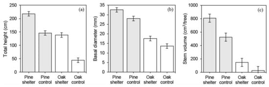 (a) Total height (b), basal diameter, and (c) stem volume of underplanted red oak and white pine in the tree shelter and control treatments (no deer protection) after 6 growing seasons in young forest stands. The interaction effect is not significant for total height (p = 0.19), basal diameter (p = 0.81) and stem volume (p = 0.19). The Species effect is significant at p < 0.001 for all variables. The Deer protection treatment effect is significant at p < 0.001 for total height and at p < 0.01 for basal diameter and stem volume. Pine = white pine and Oak = red oak.