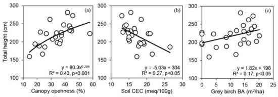 White pine (Pinus strobus) total height after 6 years in the tree shelter treatment as a function of (a) canopy openness, (b) soil cation exchange capacity (CEC) and (c) basal area (BA) of grey birch (Betula populifolia) in the overstory. N = 25 plots for each relationship.
