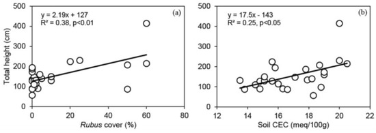 Red oak (Quercus rubra) total height after 6 years in the tree shelter treatment as a function of (a) cover of Rubus species in the understory and (b) soil cation exchange capacity (CEC). N = 25 plots for each relationship.
