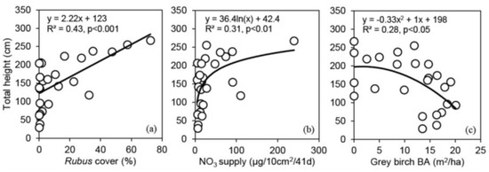 Bitternut hickory (Carya cordiformis) total height after 6 years as a function of (a) cover of Rubus species in the understory, (b) soil NO3 supply rate and (c) the basal area (BA) of grey birch (Betula populifolia) in the overstory. N = 25 plots for each relationship.