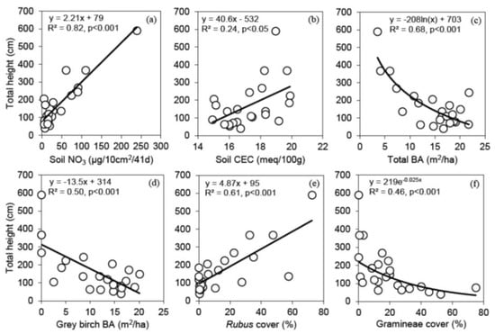 Black walnut (Juglans nigra) total height after 6 years as a function of (a) soil NO3 supply rate, (b) soil cation exchange capacity (CEC), (c) total basal area (BA) of trees in the shelterwood, (d) basal area (BA) of grey birch (Betula populifolia) in the overstory, (e) cover of Rubus species in the understory and (f) total cover of grass (Gramineae) species in the understory. N = 23 plots for each relationship.