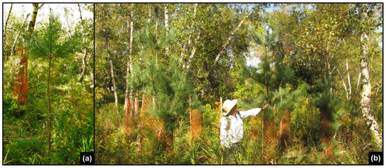 (a) Heavy browsing on white pine lateral branches in the control treatment. (b) White pines in the tree shelter treatment growing in the Grey birch-balsam poplar-elm community type (6th growing season).