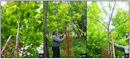 - Bardon, R.E.; Countryman, D.W.; Hall, R.B. Tree shelters reduced growth and survival of underplanted red oak seedlings in southern Iowa. North. J. Appl. For. 1999, 16, 103–107. [Google Scholar]