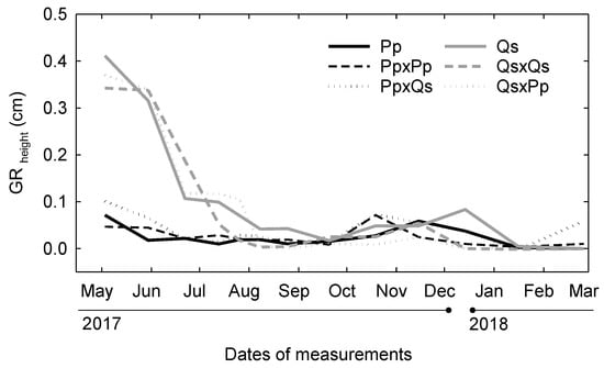 Height growth rate (GRheight) for each species and species combination during the experiment.