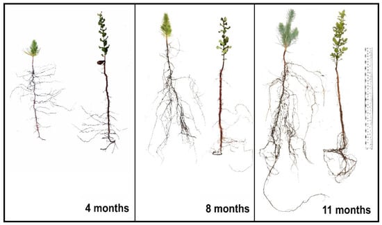 During the seedling stage and under ample water and nutrient conditions, the root growth and morphology of Qs and Pp showed contrasting patterns suggesting complementary soil exploitation interactions in interspecific mixtures and potential competition in intraspecific mixtures. The mixture of Qs with Pp seems to be advantageous in the first stages of plant development as Pp develop abundant mycorrhizae symbiosis formations which elicit mycorrhization of Qs plants coexisting in the same pot. Further studies are needed to complement these results, namely the establishment of field experiments with cork oaks growing under stone pine canopies. Further greenhouse studies should be also carried out combining biotic and abiotic stresses under mixed stands.