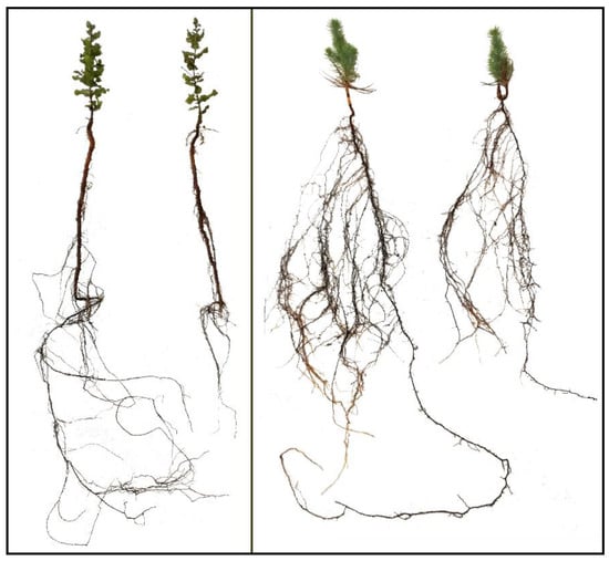 Root morphology, growth and architecture of Qs and Pp were remarkably different in the seedling stage, with Qs investing in a woody taproot able to penetrate the deep soil layers very fast and earlier than Pp. While Pp showed a dense lateral fine root development occupying all the pot profile, Qs’ fine roots were mostly concentrated in the base of the pot with only a few lateral roots branching from the taproot. This growth pattern was observed in other cork oak greenhouse studies []) and also in young and mature trees in natural conditions []. As a drought-avoiding species, adult Qs develop a network of sinker roots able to efficiently exploit groundwater during the summer and hydraulically redistribute it to superficial roots, allowing the maintenance of transpiration rates during this critical season. This is an important plant survival strategy in arid and semi-arid regions. However, it is unlikely that such a complex hydraulic system is already efficiently established in early stages of the plant development and able to overcome the Mediterranean summer when the water table drops dozens of meters. Watering during summer in order to avoid premature death may be a solution, but only in particular cases as it is technically and economically impractical for most forest owners. The use of nurse species for this purpose, like stone pine, seems to be viable according to the results of this study, although much more investigation is clearly needed.