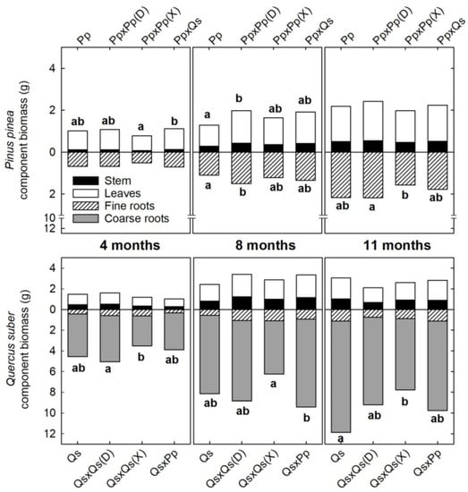 Biomass partition in Quercus suber (Qs) and Pinus pinea (Pp) for the three harvesting campaigns at 4, 8 and 11 months old and for the different species mixtures. One plant per pot (Qs or Pp), two plants of the same species per pot (the intraspecific combinations Qs×Qs and Pp×Pp) and two plants of different species per pot (interspecific combinations Qs×Pp or Pp×Qs, the first two letters varying according to the species under evaluation). D stands for the dominant and X for the supressed plant in the mixture. Significant differences (p < 0.05) between Qs and Pp combinations for each harvesting campaign represented by different letters (a and b). Bars above 0 for aboveground biomass and under 0 for the root biomass).