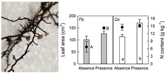 Plant one-side leaf area (bars) in the 3rd harvesting campaign (11 months) in plants with microbial infections (Presence) and without them (Absence) for each species (Pp in grey bars, Qs in white bars). Dots represent average values for N content in leaves with the corresponding standard error. Letters in small caps (a and b) show statistical differences for leaf area and all caps (A and B) for the differences for N content in the leaves. In the left a picture of the mycorrhiza symbiosis found in Pp.