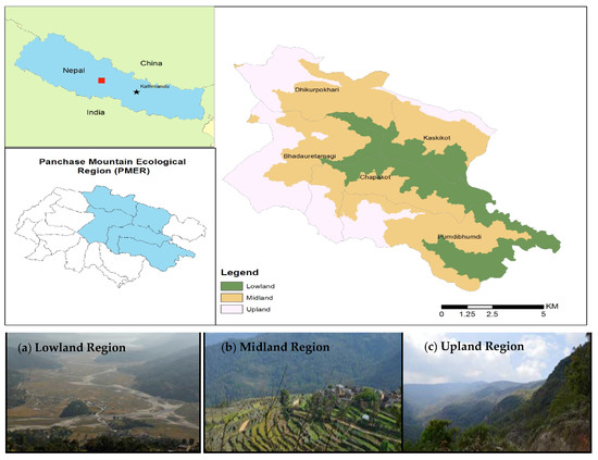 Map of study area in the Panchase Mountain Ecological Region, with lowland (a) midland (b), and upland (c) regions, based on altitudinal variation.