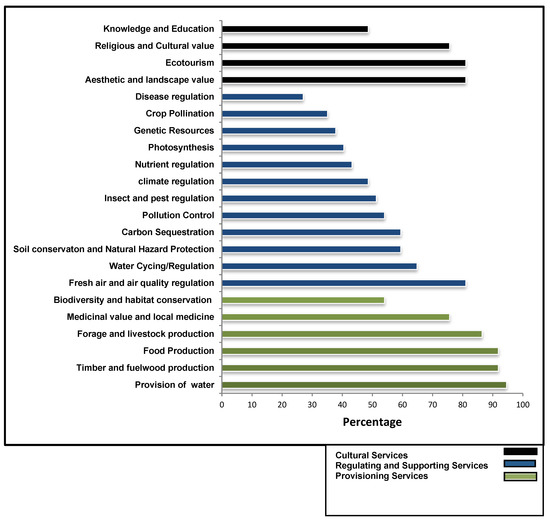 Though there were higher numbers of regulating services identified, most of the respondents identified and acknowledged that the provisioning services such as provision of water, food, different forest products (timber, fuel wood, forage) to be more important than regulating and supporting services such as climate regulation, soil conservation, nutrient regulation, and disease control. However, >80% of the respondents recognized the value of fresh air and air quality regulation. Likewise, about 80% of the respondents also identified that the PMER has aesthetic and landscape value, value for ecotourism, and religious and cultural significance (Figure 2).