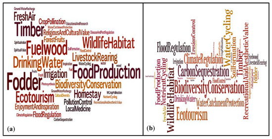 Prioritization of ES by Forest Users—Figure (a); and Forest Managers—Figure (b) in the PMER, Nepal. The word size indicates the priority of respective ES—the larger the font size, the higher the priority by the respondents.