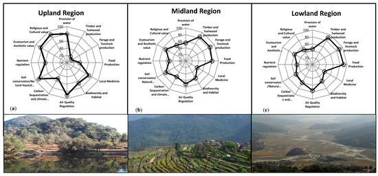 Among forest users, respondents from different regions have different priorities (Figure 4); for example, respondents in the upland region, which contains the core protected forest area, with cultural and biodiversity significance, and infertile agriculture land, valued their ecosystems for soil conservation, aesthetic beauty and ecotourism, religious and cultural significance, along with biodiversity, ecotourism and medicinal value. On the other hand, forest users from the midland region, which contains a mix of both production landscape and forest products, valued provisioning services for production of food, fodder, fuel wood and timber, while putting some priority on other services such as biodiversity, air quality regulation, soil conservation, ecotourism. Similarly, in the plains of the production landscape in the lowland area, most respondents put a higher priority on production of food and forest products. Therefore, priority of ES was based upon the requirements of the stakeholders and the environmental context of their region.