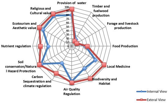 Prioritization of ES among stakeholders differed on the basis of their background, particular features of their landscape, professional engagement, and individual interests. Respondents from different locations but with the similar backgrounds had different priorities in terms of ES. For example, forest users prioritized provisioning ES such as provision of food, water, timber, fuel wood, and fodder, whereas forest managers prioritized regulating and cultural services such as biodiversity conservation, flood regulation, carbon sequestration and climate regulation, ecotourism and wildlife habitats (Figure 3).