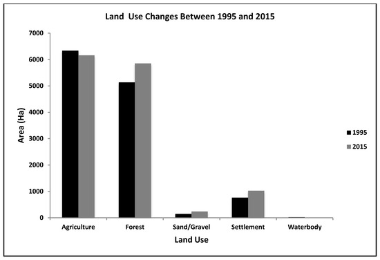 Changes in land use pattern data (Figure 8) indicate that the agriculture area decreased by a small amount and changes in sand and/or gravel and water body appear to be negligible.