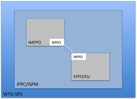 Relationship between phytosanitary organisations as indicated by different coloured boxes; figure adapted from Klapwijk et al., 2016 [52]. Abbreviations. WTO: World Trade Organization, SPS: Agreement on the Application of Sanitary and Phytosanitary Measures, IPPC: International Plant Protection Convention, ISPM: International Standards for Phytosanitary Measures, NAPPO: North American Plant Protection Organisation, NPPO: National Plant Protection Organisation, EPPO: European and Mediterranean Plant Protection Organization.
