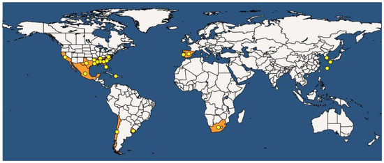 World map of the current distribution of Fusarium circinatum represented by yellow dots [50].