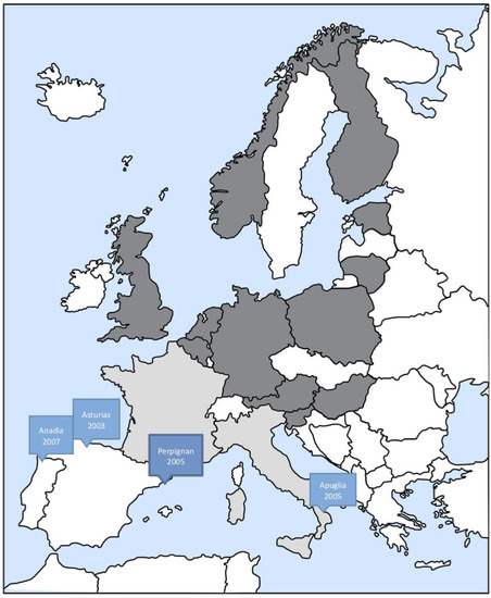 Year and location of first reports of Fusarium circinatum in countries within the European Union according to EPPO [70]. White = no information available, Light grey = pest absent, eradicated; grey = pest absent, confirmed by survey, black = pest present.
