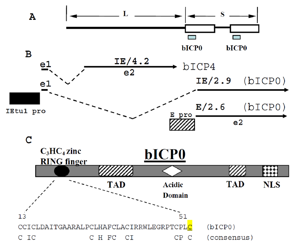 Schematic of bICP0 gene within the BoHV-1 genome. Panel A: Schematic of BoHV-1 genome and location of bICP0 gene. The Unique Long (L) and Unique Short (S) regions of BoHV-1 are denoted. Panel B: Position of bICP4 and bICP0 transcripts is shown. The immediate early transcription unit 1 (IEtu1) encodes bICP4 (IE/4.2) and bICP0 (IE/2.9) [148,149]. The IEtu1 promoter activates IE expression of IE/4.2 and IE/2.9 (IEtu1 pro). E/2.6 is the early transcript that encodes bICP0 and an early promoter (E pro) activates expression of this transcript [147]. Exon 2 (e2) of bICP0 contains all of the protein coding sequences of bICP0. The dashed lines are intron sequences. Panel C: Schematic of bICP0 protein and known functional domains. The functional domains include a NLS (nuclear localization sequence, TAD (transcriptional activation domain), Acidic Domain, and the C3HC4 zinc RING finger. Amino acid sequence (residue 13-51) of the C3HC4 zinc RING finger in bICP0 is shown. The consensus residues in a C3HC4 zinc RING finger are also shown. The mutated cysteine at position 51 is highlighted in yellow and is underlined.
