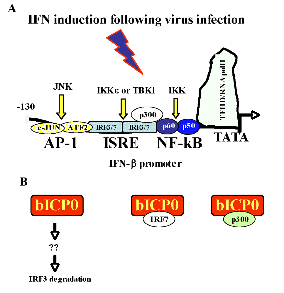 Activation of IFN-β promoter activity and how bICP0 inhibits IFN-β promoter activity. Panel A: Schematic of the human IFN-β promoter necessary for inducing an IFN response to virus infection [2,80,86]. The NF-B binding site is bound by the two proteins, p60 and p50, that comprise the NF-B transcription factor. A summary of signaling pathways that induces IFN-β promoter activity is presented [7,32,42,54,72,109,119,133,142,143,153]. Panel B: A schematic of the known steps by which bICP0 inhibits IFN-β promoter activity. For details, see text.