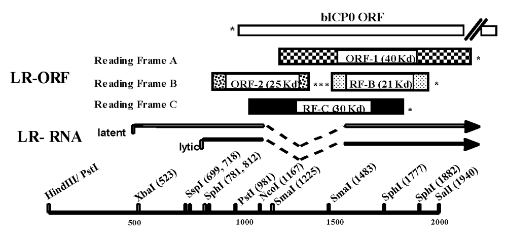 Schematic of the BoHV-1 LR gene and primers used in this study. Partial restriction map, location of LR-RNA, organization of LR ORFs, and the bICP0 ORF. Start sites for LR transcription during latency and productive infection were previously described [44]. Reading Frames B and C contain an open reading frame, but lack an initiating Met. The (*) denotes the positions of stop codons that are in frame with the respective ORF.