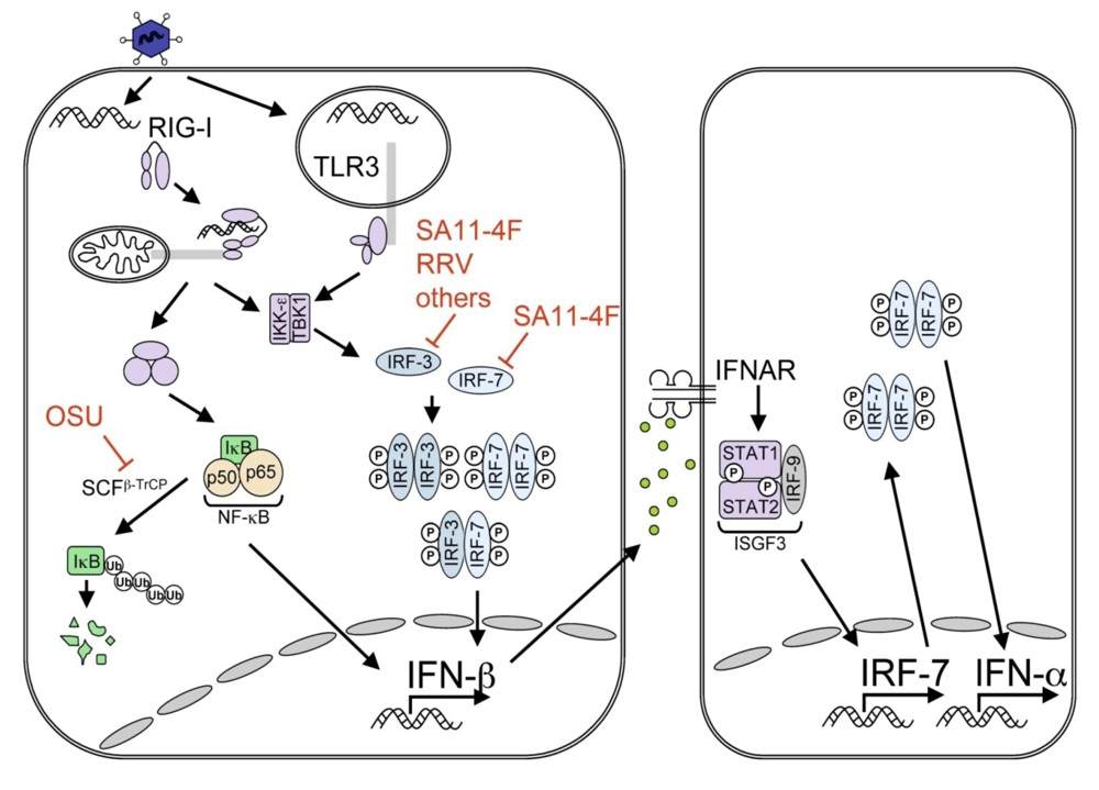 The innate immune system provides an immediate mechanism of suppressing the replication and spread of viruses. The production of type I interferon (IFN), including IFN-β and IFN-α subtypes, is critical to an effective innate immune response. Type I IFNs activate the expression of hundreds of IFN-stimulated genes (ISGs), which play critical roles not only in the innate immune response, but also in B-cell and T-cell activation, cell cycle regulation, and apoptosis [1,2]. ISGs can interfere with viruses at various stages of their replicative cycle. To counteract the innate immune response, most viruses have evolved mechanisms to subvert IFN signaling, including rotaviruses (RVs), members of the Reoviridae family. RV antagonizes the IFN induction pathway through the action of the nonstructural protein NSP1, which induces the proteasomal degradation of one or more transcription factors necessary for the efficient expression of type I IFN (Figure 1).