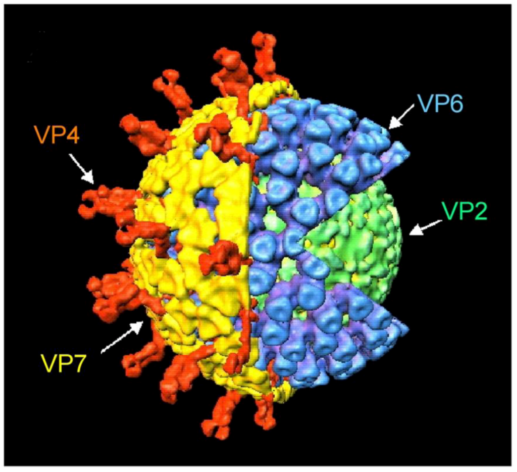 The RV virion is an icosahedral particle composed of three concentric layers of protein that encapsidate 11 segments of dsRNA (Figure 2) [22,23]. The virion core includes the inner shell protein VP2, small amounts of the viral RNA-dependent RNA polymerase (RdRP) VP1 and the mRNA-capping enzyme VP3, and the segmented dsRNA genome [24-26]. Cores surrounded by a protein layer formed by VP6 represent double-layered particles (DLPs). In the infected cell, DLPs are transcriptionally active and are responsible for the synthesis of the 11 viral mRNAs [27,28]. The outer protein layer of the capsid is comprised predominantly of the glycoprotein VP7. Protruding from the VP7 layer are spikes formed by the protease-sensitive attachment protein VP4. VP4 and VP7 induce neutralizing antibody responses in the infected host, and are the basis for immunological protection against subsequent disease [29].