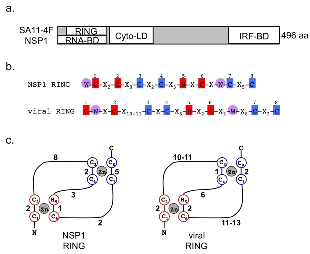 Schematic of general location of structural and functional domains in SA11-4F NSP1; RING finger domain (RING); RNA-binding domain (RNA-BD); cytoplasmic localization domain (Cyto-LD); IRF-binding domain (IRF-BD). (b) Comparison of the consensus sequence of the RING finger domain of group A and C RV NSP1 and the viral RING domain. Conserved residues proposed to bind to first zinc ion highlighted in red boxes and conserved residues proposed to bind to second zinc ion highlighted in blue boxes. Numbers above boxes correspond to sequential numbering of metal ligands. Conserved tryptophan residues highlighted in violet circles. (c) Predicted cross-brace organization of the RING finger domain of NSP1 and comparison to the known viral RING domain organization. Subscript numbers correspond to sequential numbering of metal ligands, and interspersed numbers correspond to the residues between metal ligands
