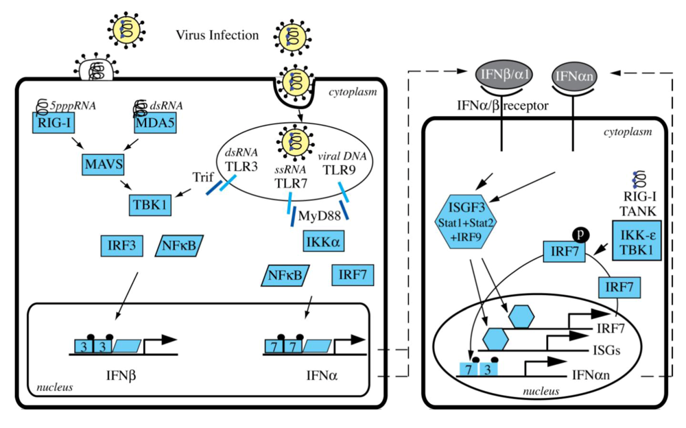 The cytosolic pathway of type I IFN induction is initiated by the recognition of viral 5’triphosphate RNA and dsRNA by RIG-I and MDA5. Binding of viral RNA leads to a conformational change of these sensors that results in their binding to MAVS (also called IPS-1, Cardif, VISA), an essential downstream adaptor in the cytosolic pathway []. Through as yet unidentified mediators, MAVS propagates the signal to the TBK1 and IKKi kinases that finally activate IRF3 and NF-κB (Figure 1).