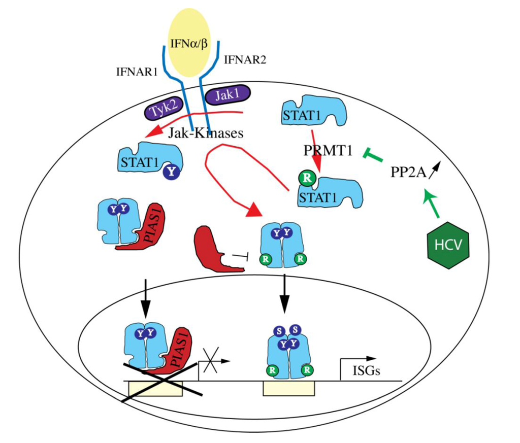 Further investigations of the molecular mechanisms of HCV interference with IFN signaling identified protein phosphatase 2A (PP2A) as an important mediator in the inhibitory pathway []. The catalytic subunit of PP2A, PP2Ac, was found to be overexpressed as a result of an endoplasmatic reticulum (ER) stress response induced by HCV protein expression []. PP2Ac was overexpressed in cells after HCV protein expression, in liver extracts of HCV transgenic mice, and in liver biopsies of patients with CHC []. Furthermore, expression of a constitutive active form of PP2Ac in Huh7 cells resulted in an inhibition of STAT1 DNA binding []. PP2A can directly bind to protein arginine methyltransferase 1 (PRMT1) and inhibit its enzymatic activity []. This inhibition of PRMT1 results in a decreased methylation of a number of proteins, amongst them STAT1 []. It has been reported that the arginine methylation of STAT1 regulates the association of STAT1 with the inhibitor PIAS1 [], a finding that is still controversial []. Nonetheless, we have found that inhibition of PRMT1 by increased expression of PP2Ac leads to an increased association of STAT1 with PIAS1, a finding that could well explain the impaired DNA binding of activated STATs in HCV infected cells []. Interestingly, treatment of cells with the methyl group donor S-adenosyl-methionine restored normal IFN signaling in cells with HCV protein expression and increased the potency of IFNα in the HCV replicon system []. Our current working model of HCV interference with IFN signaling is shown in Figure 3.