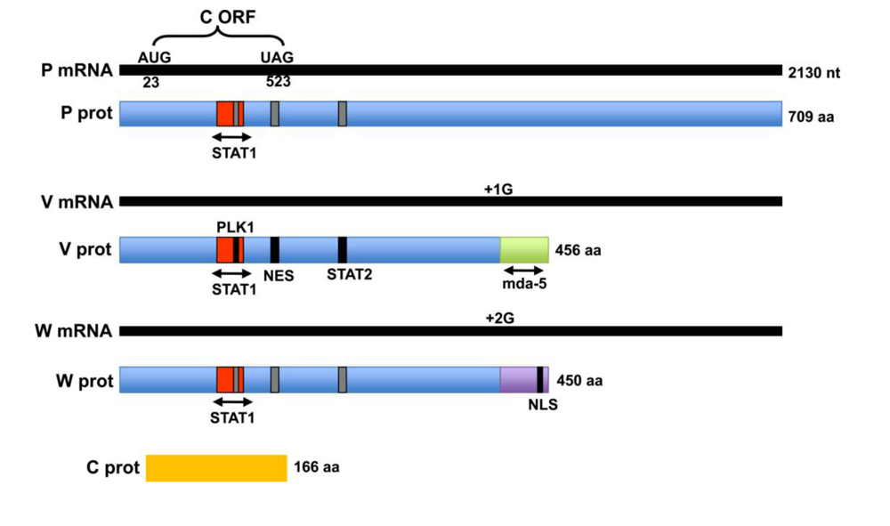 Illustration of the four protein products of the NiV P gene. The P, V and W mRNA transcripts are shown in black with the encoded proteins shown below. The C protein (encoded by the alternate ORF shown in the P transcript) is depicted in yellow. The unique C-termini in V and W, representing the +1 and +2 frames, are shown in green and purple, respectively. Functional domains that control protein localization or protein interactions are noted. The STAT1 binding domain within the N-terminal portion of P, V and W proteins is shown in red. Domains that have been characterized only in the context of the V protein are shown in black on the V protein and in gray for the corresponding positions on the P and W proteins. NES = nuclear export signal, NLS = nuclear localization signal.