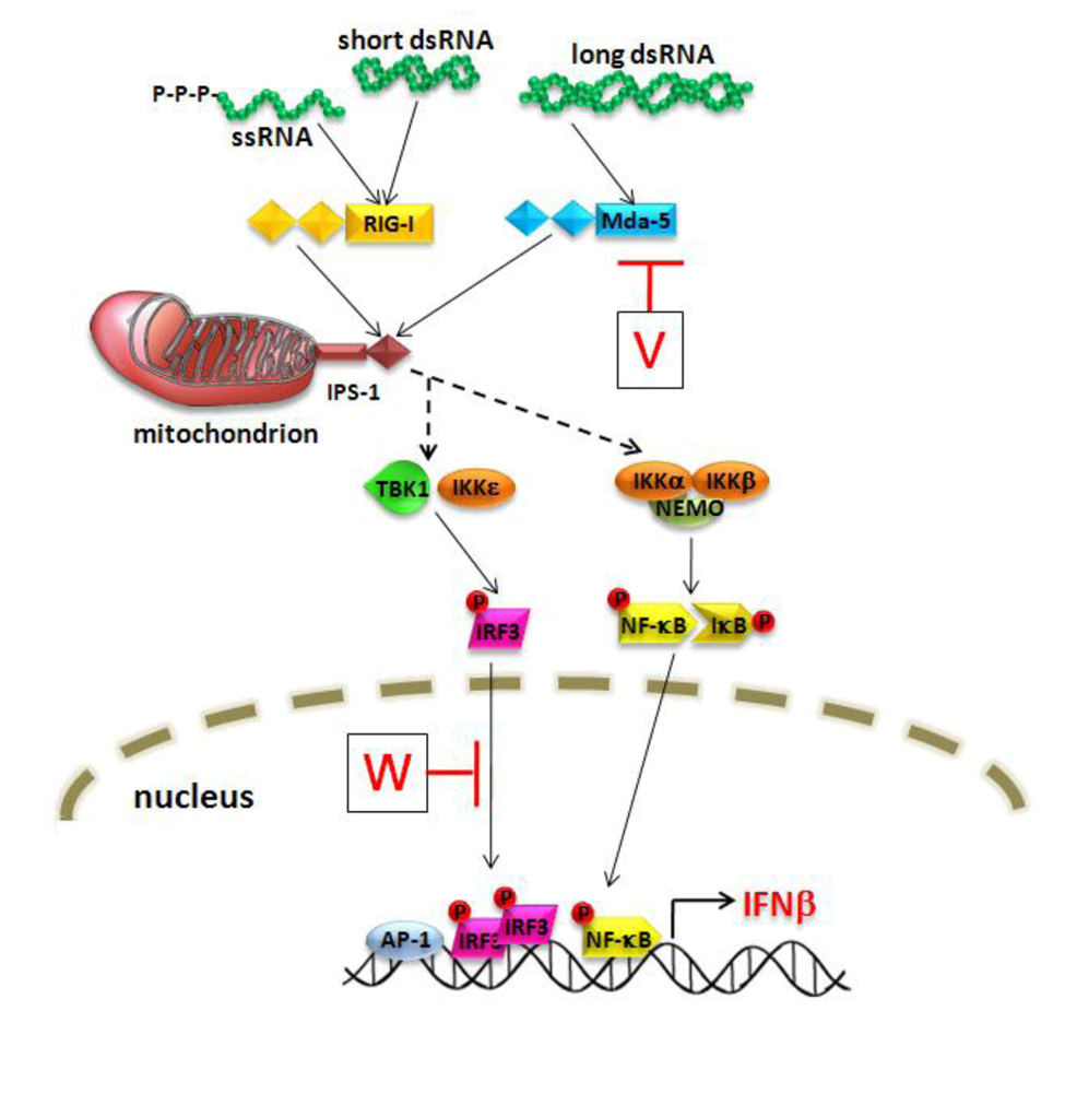 Illustration of virus-activation of IFN-β synthesis and its inhibition by the henipavirus V and W proteins. Detection of viral RNAs by RIG-I and mda-5 activates a signaling cascade though IPS-1 leading to the phosphorylation of IRF3 and NFκB. The activated transcription factors translocate to the nucleus and induce synthesis of IFN-β. The V protein prevents signaling by interacting with mda-5, while the W protein interferes with the activated form of IRF3 in the nucleus.