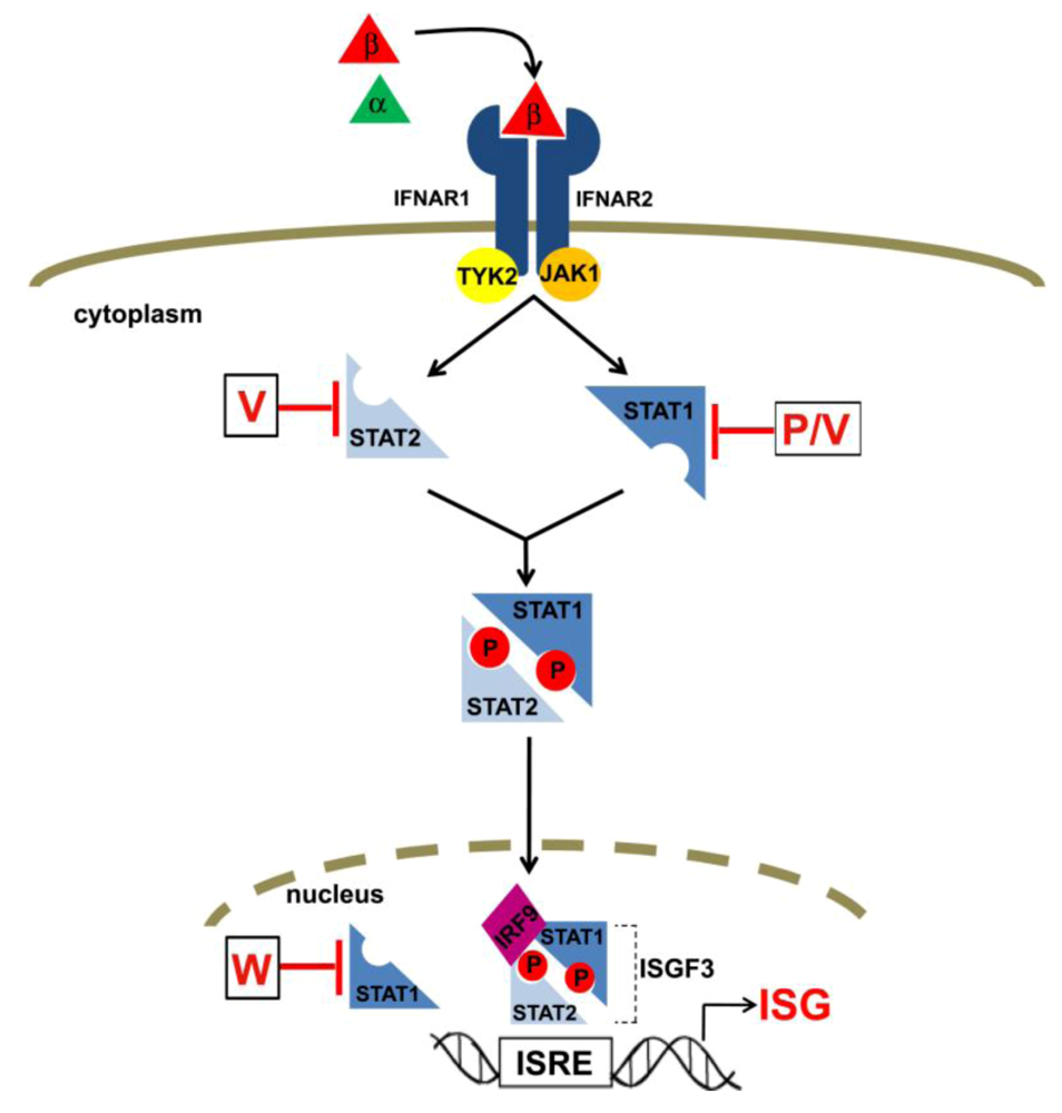 Both type I (α/β) and type II (γ) interferons (IFN) mediate their effects on cells by binding to receptors on the cell surface and activating the JAK-STAT signaling pathway []. STAT (Signal Transducers and Activators of Transcription) proteins are transcription factors that are mainly cytoplasmic in their inactive state. In response to IFN-α/β, STAT1 and STAT2 become tyrosine phosphorylated, dimerize, and translocate to the nucleus (Figure 3). The activated heterodimer complexes with interferon regulatory factor (IRF) 9 to form the ISGF3 (IFN stimulated gene factor 3) complex. ISGF3 binds to IFN-stimulated response elements (ISRE) located in the promoters of IFN-stimulated genes (ISG) and activates transcription leading to the production of many proteins that have antiviral activity. For this reason many viruses have mechanisms to inhibit the JAK-STAT signaling pathway and paramyxoviruses in particular have a preference for targeting the STAT proteins []. Interestingly, they do so via distinct mechanisms and the henipaviruses act by sequestering STATs and preventing their activation in response to IFN.
