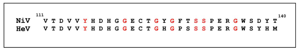 An alignment of the STAT1 binding domain (residues 111-140) in the P, V and W proteins of NiV and HeV. Those residues that have been shown to be critical for the STAT1 interaction are shown in red.