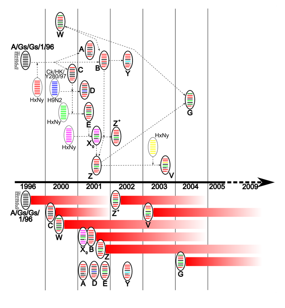 By 2001, eight genotypes (A, B, C, D, E, X0, W, Z) had been identified in Hong-Kong and China (Figure 1), derived from A/Gs/Gd/1/96-like viruses, from an H9N2 avian virus (Chicken/Hong Kong/Y280/97), and other unknown viruses [,,]. By 2003, three other major genotypes had arisen (Y, Z+, V) [,]. In 2004, the reassortment between genotypes Z and W led to the emergence of a new genotype, G []. Amongst all these genotypes, only a few persisted for longer than two years (B, Z, Z+, V, G, W, and X0) suggesting the acquisition of efficient survival capacities (Figure 1) [].