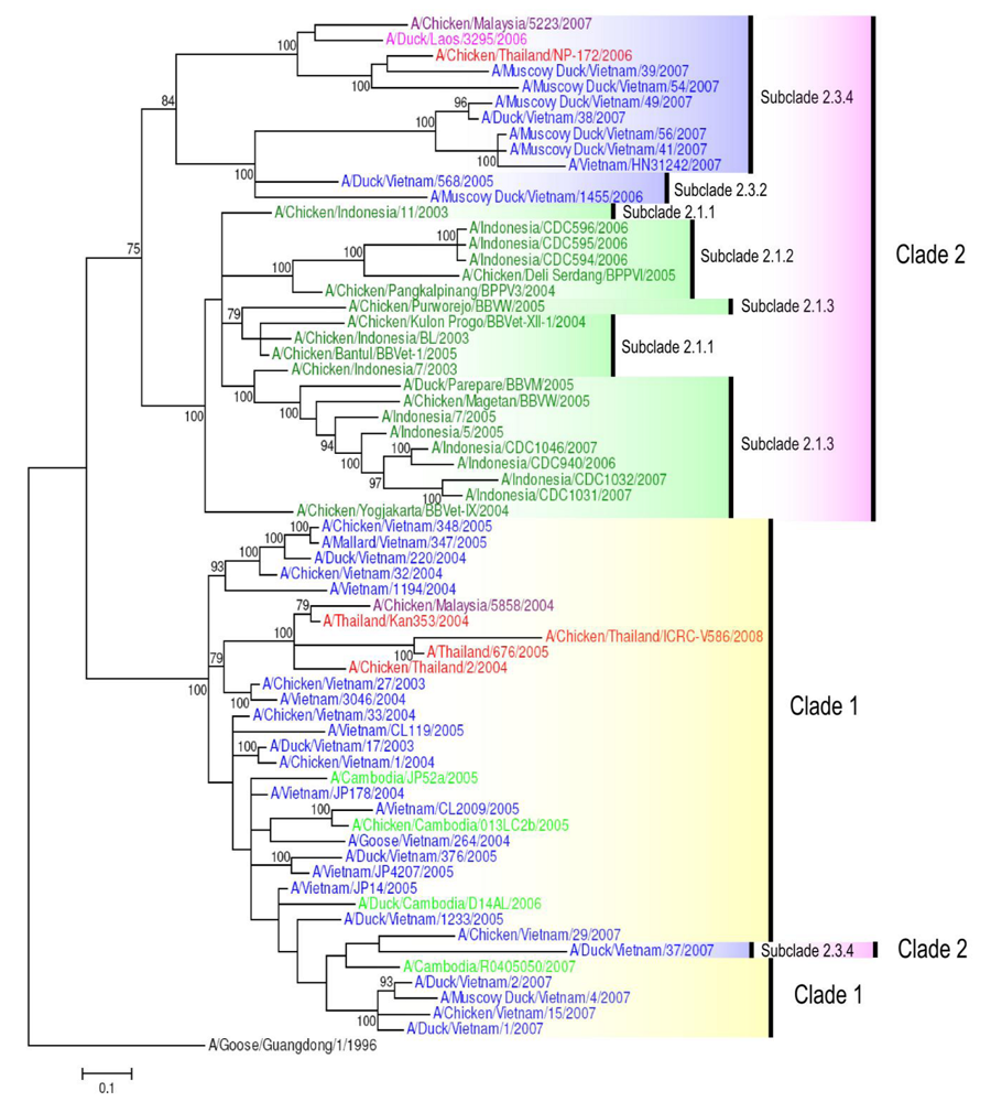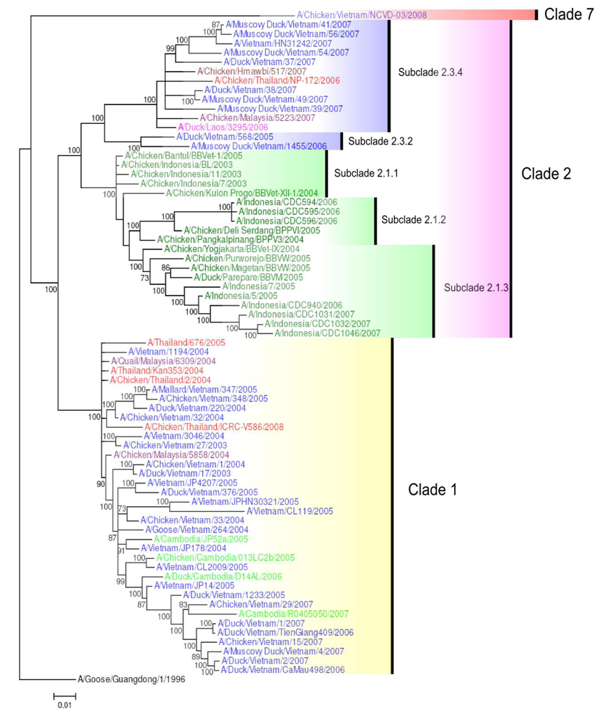 Phylogenetic tree of the HA gene of representative South East Asian H5N1 viruses. Analysis of HA gene based on full length gene sequences. The tree was generated by Bayesian analysis using MrBayes v3.1.2 [57]. Numbers on branches indicate Bayesian posterior probability values. The tree was rooted to A/Goose/Guangdong/1/1996. Scale bar: 0.01 substitutions per site. Colors used for the different countries are: Cambodia = light green; Indonesia = dark green; Lao PDR = pink; Malaysia = purple; Myanmar = maroon; Thailand = red; Vietnam = blue.