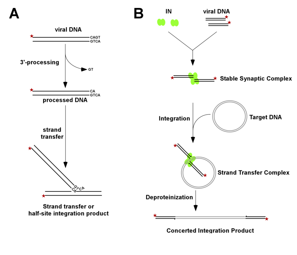 The integration of viral DNA into a host chromosome involves two chemical reactions. In the first step, which is called 3’-processing and takes place in the cytoplasm shortly after the viral DNA is made, IN hydrolyzes a GT dinucleotide from each 3’ end of the viral DNA. In the second step, IN catalyzes concerted integration of the processed viral DNA ends into chromosomal DNA. The sites of attack on the two target DNA strands are separated by 5 bp for HIV-1 IN, which leads to DNA strand dissociation in the small double-stranded DNA fragment between the attachment sites. The subsequent repair of the intermediate species by cellular enzymes completes the integration reaction.