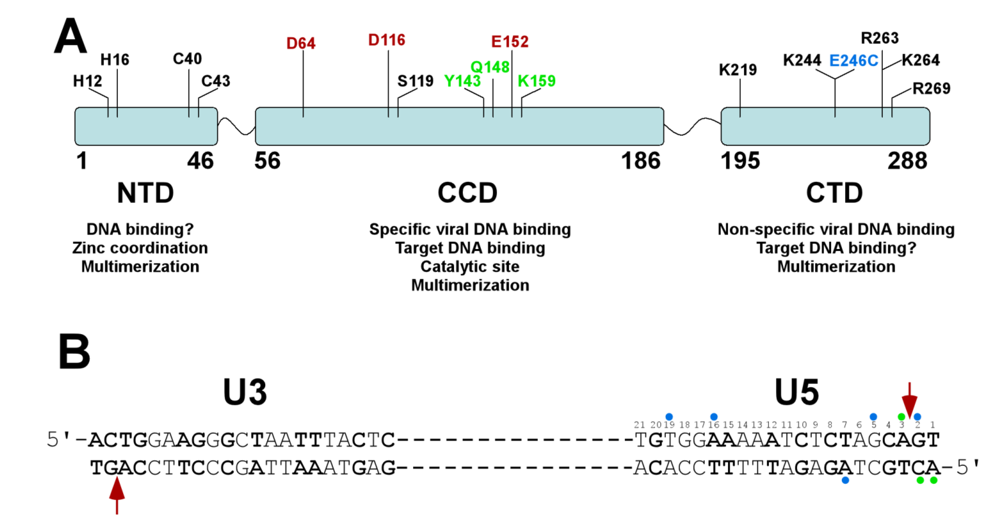 (A) Schematic presentation of the three domain structure of HIV-1 IN. The NTD residues (H12, H14, C40 and C43) coordinate Zn and contribute to the functional multimerization. It is not entirely clear whether the NTD directly binds viral or target DNA. The CCD contains the catalytic DDE motif. This domain interacts with both viral and target DNA. A number of residues (Y143, Q148 and K159) selectively interact with terminal U5 bases, while S119 has been implicated in direct interactions with the target DNA. The CCD is also critical for the functional multimerization. The CTD is highly basic and non-specifically interacts with viral DNA. Several CTD residues implicated in viral DNA binding are indicated. It remains to be determined whether the CTD could also coordinate the target DNA. (B) Sequences of U3 and U5 termini of viral DNA. The base-pairs that are identical in U3 and U5 sequences are in bold. A majority of IN-viral DNA mapping experiments used the U5 sequence and the interacting sites are indicated with circles. Note color coordination between the residues in A and respective nucleotide positions in B. The catalytic residues in A and the arrow pointing to the specific cleavage sites at U3 and U5 termini are in red. The CCD amino acids Y143, Q148 and K159 (colored green) have been shown to selectively crosslink with the terminal nucleotides marked with green circles [60]. The E246C mutant is colored blue and its multiple crosslinking sites [61] in viral DNA are depicted by blue circles.