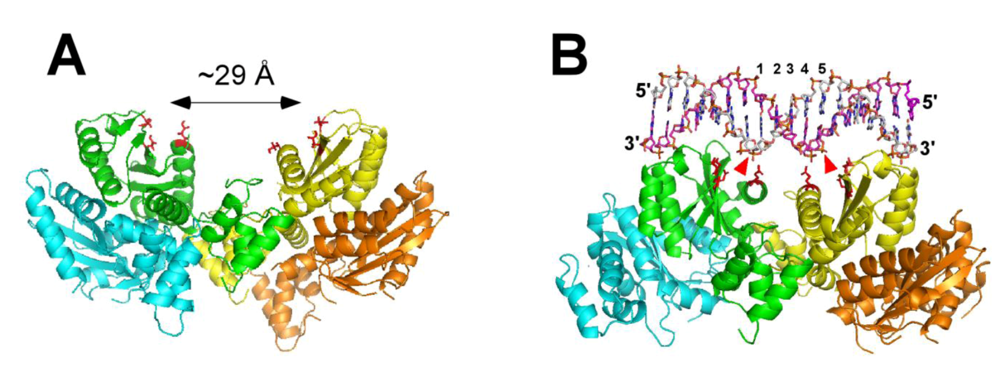 Molecular models for two distinct forms of HIV-1 IN tetramers. (A) An “open” conformation of tetrameric IN. This model is based on the HIV-1 IN two domain (NTD-CCD) structure [41] and our MS footprinting results [48] indicating that such a conformation is stabilized by LEDGF/p75 in the absence of viral DNA. This “open” conformation of tetrameric IN could catalyze 3’-processing and half-site integration reactions, however an incorrect spacing (~29 Å) between the two active sites would hamper the concerted integration. (B) A “closed” conformation of HIV-1 IN tetramer. This model was built by Hare et al. using one of the crystal forms of the MVV IN structure [47], where the catalytic sites are positioned optimally for concerted integration. It has been proposed that this structure could be stabilized by two viral DNAs [47]. However, viral DNAs have not been included in the model. Instead, the relative positioning of two catalytic sites with respect to the target DNA is shown to demonstrate the 5 bps separation consistent with a pair-wise integration. Red arrows point to the target scissile bonds. Individual subunits are colored cyan, green, yellow and orange. Side chains of catalytic residues in green and yellow subunits are depicted in red. For clarity only NTD-CCD fragments are depicted, while the CTDs, which are also present in these models [47,48], are not shown.
