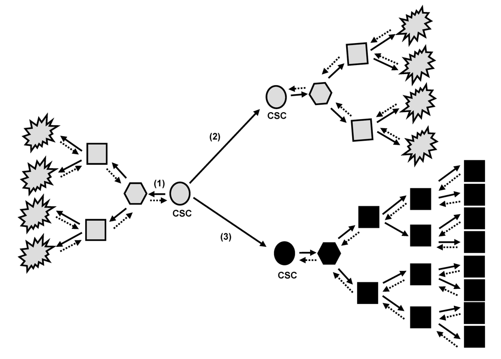 The cancer stem cells (CSC) model. Proposed hierarchical organization of a malignant clone. CSC have self-renew and tumorigenic capacities. They can give rise to more and more differentiated cancerous cells which the last ones in the hierarchical organization may have low or absent proliferative capabilities (1). During asymetric division at self-renew, the original CSC can give birth to the identical CSC (2) that will lead to the same tumor clone (grey), or can give birth to a genetically/epigenetically modified CSC (3) that will lead to a more aggressive tumor clone (black) with differentiation blockage and higher proliferative capabilities. To date, it is not clear whether the more differentiated cells can revert back and regain a more stem cell properties. As appreciated from the definition of a CSC, this cell is not necessarily derived from a normal tissue stem cell. Alternatively, hypothetical genetic/epigenetic changes caused in more committed and differentiated cancerous cells might be very well involved in mechanisms allowing these cells to acquire cancer stem cell capabilities.