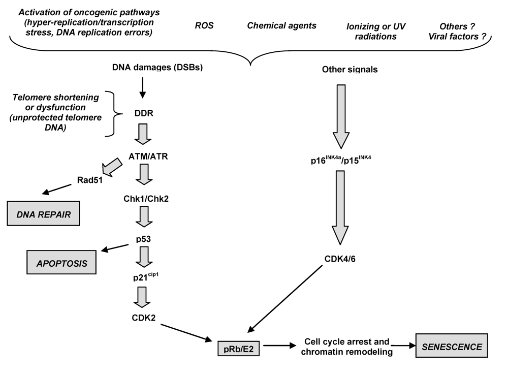 The proposed molecular mechanisms of cellular senescence. Oncogenic stress result in DNA damages as double strand breaks (DSBs) that lead to activation of ATM/ATR kinases. This leads to stabilization of the Rad51 repair protein needed for DNA DSB repair. Besides DNA repair induction, cooperative action of ATM/ATR, ARF and Chk1/Chk2 and p53 is crucial for the induction of either apoptosis or cell cycle arrest and induction of senescence. Another possibility is that other factors such as reactive oxygen species (ROS) or other physical, chemical of viral agents could induce the accumulation of DNA damages or activate, by alternative mechanisms, the p15INK4b/p16INK4a cascade. All known senescence pathways converge at the level of activation of CDKIs (p15INK4b, p16INK4a and p21Cip1) that keep the pRb protein under its active form. The pRb inhibits E2F and prevents the expression of growth-promoting genes for cell cycle exit. Furthermore, pRb recruits growth-promoting genes into a facultative chromatin structure for permanent silencing and growth arrest.