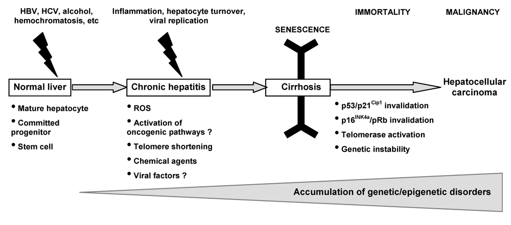 HCC is a major problem of public health, and a better understanding of hepatocarcinogenesis will help to identify pertinent molecular targets for innovative therapies. Although high output microarray analysis from tumor bulks have allowed to classify HCCs to predict outcome of patients, huge efforts are being done to identify liver cell types the most permissive to support the different genetic/epigenetic hits needed for cancerous transformation, and to accurately determine the sequence of these events. It has been clearly shown that cancer stem cells are indispensable for tumorigenicity, and much is being done to understand whether they come from transformation of normal liver stem cells or from de-differentiation of mature heptocytes that would have re-acquired stem cell properties. At preneoplastic steps, senescence has been shown as being a powerful anti-oncogenic mechanism in different cellular models supporting DNA stress secondary to oncogenic pathway activation, ROS production and/or telomere shortening for instance. Few is known in hepatocarcinogenesis at preneoplastic steps, but c-myc and Wnt/β-catenin oncogenic pathways might be of relevance as well as ROS production and maybe viral factors. Cirrhosis could represent the senescent step where cell cycle arrest of hepatocytes is controlled by key checkpoints such as p53/p21Cip1 and p16INK4a/pRb. Their inactivation is a prerequisite for the pre-senescent cell to bypass senescence and to re-enter cell cycle progression, mechanisms that might be controlled by the Wnt signalling and the activity of Twist proteins, although it remains to be determined in hepatocarcinogenesis. Finally, abrogation of anti-proliferative signals and of apoptosis, allow the post-senescent cell to become cancerous. However, one should keep in mind that tumors arise in a context of facilitating microenvironment (mesenchymal cells, immune response), and genetic/epigenetic hits necessary for cancerous phenotype in one single liver cell is not enough per se to allow tumor bulk to develop. All this angle of hepatocarcinogenesis has not been tackled in this paper. Additionally, of interest will be the chapter on interplays between HBV and HCV factors in hepatocarcinogenesis.