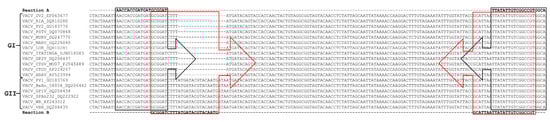 Alignment of the target DNA region within the A56R gene of the Vaccinia virus used for primer sequence design. The virus sequences were obtained from GenBank and the accession numbers are shown in the figure. The alignment was performed using the standard parameters of CLUSTAL W. The primers used in Reaction A (A56R-gen F and A56R-gen R) are outlined in black and, for Reaction B (A56R-BVV-nDEL F and A56R-generic R), are in red.