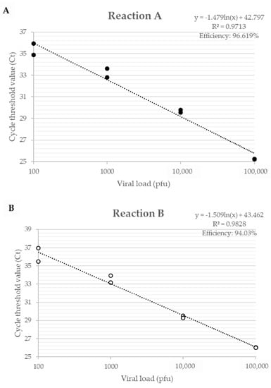 The efficiency of primers developed for the A56R gene in VACV coinfection, for Reaction A, showed an efficiency of 96.6% and an R² value of 0.971; for Reaction B, an efficiency of 94.0% and a value of R² of 0.983 (Figure 2) were found. The detection limit of the assay was 2 p.f.u./mg of tissue and the reaction was efficient in different matrices such as lung, gut, and spleen.
