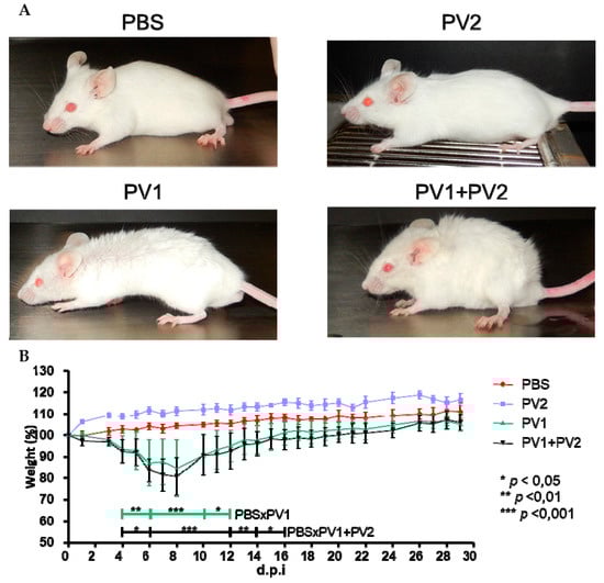 Clinical signs of Balb/c mice coinfected and monoinfected with PV1-GII and PV2-GI. Five-week-old male Balb/c mice were intranasally inoculated with 10 µL of viral suspension: PV1-GII 1 × 106 p.f.u.; PV2-GI 1 × 106 p.f.u.; PV1-GII + PV2-GI 5 × 105 p.f.u. of each sample; and a negative control group was inoculated with 10 μL of PBS. Clinical signs were observed on day 5 p.i and were recorded for 30 days post infection (d.p.i.). (A) In PBS and PV2-GI groups, no clinical signals were observed. Mice monoinfected with PV1-GII and coinfected (PV1-GII + PV2-GI) showed fur ruffling and hunching of the back. (B) The mice were daily weighed and relative mean weight was calculated. The error bars indicate standard deviations. PV1-GII: Pelotas virus 1 Group II; PV2-GI: Pelotas virus 2 Group I; PBS: phosphate-buffered saline. Asterisks indicate a statistically significant difference: * p < 0.05; ** p < 0.01; *** p < 0.001.